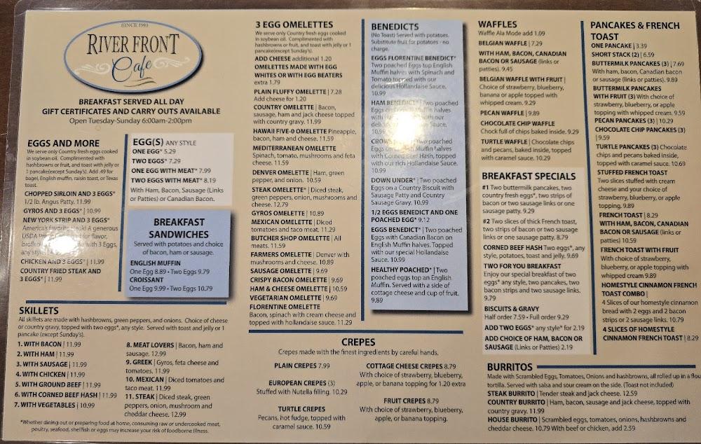 River Front Family Restaurant offers a diverse menu focused on comfort food. Breakfast selections shine brightly, with favorites like pancakes, omelettes, and hearty skillets. Creativity flows in their stuffed French toast and burritos. Each dish embodies traditional flavors.